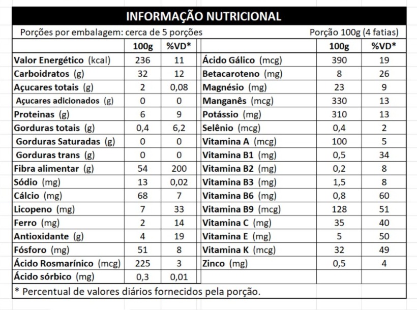INGREDIENTES:  Farinha de Trigo Sarraceno, Farinha de Milho, Fermento Biológico, Açúcar Mascavo, Sal Rosa do Himalaia, Semente de Abóbora, Açafrão da Terra, Orégano, Alho, Cebola, Aveia, Semente de Chia Dourada, Salsa  |
